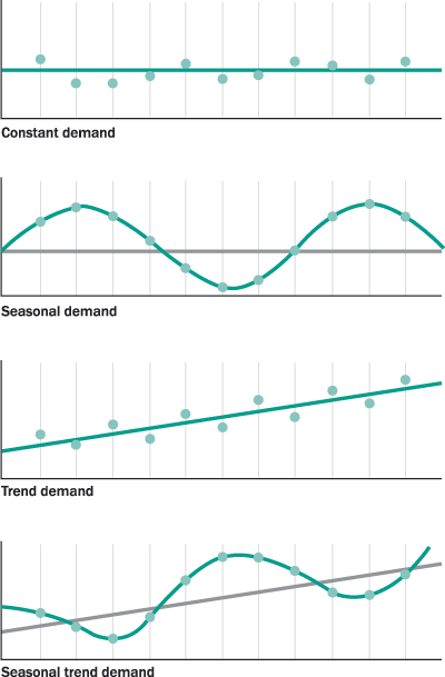 Typical demand patterns: constant, seasonal, trend, and seasonal trend