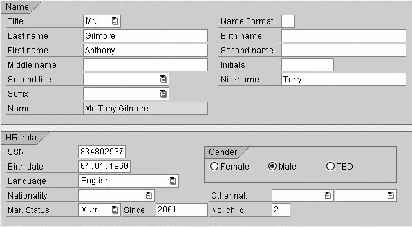 Actually Germany does have several unique infotypes. Most country-specific infotypes are related to payroll, such as tax, social security, and garnishment. However, in addition to whole infotypes, internationally-used infotypes often have special fields or features. In these cases, SAP HR uses different dynpros for each country. A dynpro is the piece of software that determines the fields and layout of the screen as well as the functionality behind it. One example is infotype 0002 (personal data).