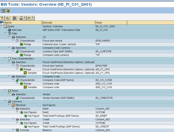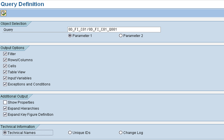 Program RSRQ_QUERYDEFINITION displays comprehensive information about a query’s components and properties. I find using this program to be more convenient than using BEx Query Designer or BEx Analyzer, which require a lot of navigation and a good understanding of their features. This program provides selection options that help you get a complete overview of the components of a query. By viewing all the components of a query, you can quickly decide whether it meets your business and reporting needs. If the query only partially meets your needs, you can determine what you need to do to close the gap.