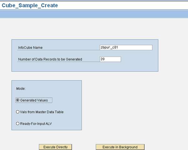 Often when you are prototyping or doing a demonstration in a development or sandbox environment, you want to show results rapidly. Although your data model is already created or available, you may not have the luxury of extracting information from a source system or copying data from another BW system. Program CUBE_SAMPLE_CREATE comes in handy for populating an InfoCube with data either manually or randomly. It provides a shortcut method of populating your prototype with sample data for demonstrating, testing, or validating a proof of concept.