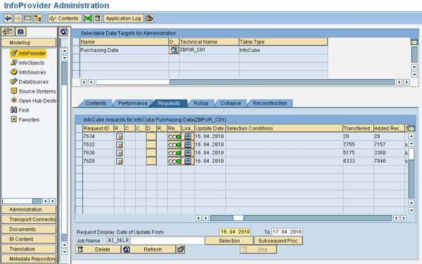 You can execute this program in the foreground by clicking Execute Directly or in the background by clicking the Execute in Background button. If you are generating a small dataset, you can run it in the foreground. Upon completion, you see the list of records that was created. A new Request ID (7634 in this case) has delivered 20 new records to this InfoCube (Figure 4). If you need to delete this Request ID (and these newly generated records), highlight the specific row and click the Delete button.