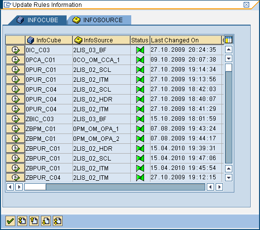 Although you have the option of entering or selecting the user name, it is not mandatory. If you keep it blank, you see all the update rules created by all the users in the InfoCube or InfoSource you specify, provided you enter the names of the InfoCube and InfoSource. I am running this for a particular user and keeping the InfoCube and InfoSource fields blank because I’m interested in seeing all the update rules maintained by this particular user. The results are shown in Figure 6 (note that I have intentionally hidden the user name column, which would be on the left side of the screen). You can navigate directly into update rule maintenance for any InfoCube on this list by clicking the execute icon in the relevant row.