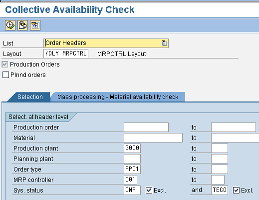 - Step 1. Run a collective availability check for several production orders using transaction COMAC. For an individual order, you can use the order change transaction CO02. The collective availability check updates the missing parts info system and sets the material shortage status (MSPT) on the order if a part is missing.