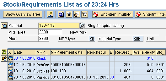 To display receipt elements scheduled for a missing part you can branch to the stock requirements list (Figure 8) from the missing part report using the Environment menu option in transaction CO24. You can also access the stock requirements list by following menu path Logistics > Production > MRP > Evaluations > Stock/Requirements List or by using transaction MD04. For Multi-level or Plant-level MRP runs use transactions MD02 and MD01, respectively.