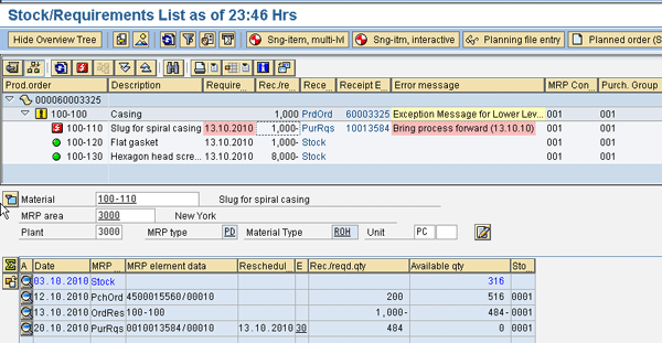 As shown in Figure 8, a requirement of 1,000 pieces cannot be met on 13.10.10 until the shortage of 484 pieces is delivered on 20.10.10. In this scenario, a planner would typically start backorder processing or contact the buyer of the material and check if a delivery is possible close to or on the requirements date.