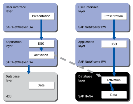 - When activating the DSO to consolidate the changed data, the activation is processed within SAP HANA instead of the ABAP application tier, improving performance due to the activation taking place in memory and the activation being parallelized as part of the MPP computing architecture of SAP HANA.