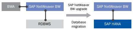 It is common for companies that run SAP NetWeaver BW on a traditional RDBMS to use SAP BWA, as traditional RDBMSs provide suboptimal performance compared to SAP BWA. However, this leads to IT departments having to manage SAP BWA, a traditional RDBMS, and the ABAP application server for SAP NetWeaver BW. As shown in Figure 3, by converting the RDBMS to SAP HANA, SAP BWA is no longer required. The system can be consolidated to only require managing the SAP HANA and SAP NetWeaver BW instances.