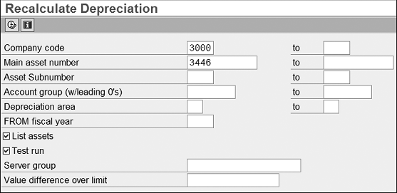 The selection screen allows you to recalculate asset values by company code, asset, depreciation area, and fiscal year. As with most asset periodic programs, a Test run indicator allows you to execute the logic of the program without carrying out any database updates. The program limits its foreground processing to approximately 1,000 records, which is usually sufficient if you’re just spot-checking a range of specific assets.