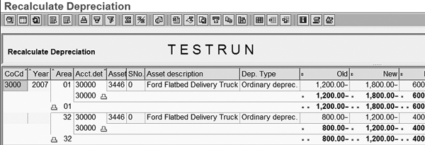 After executing the program in test mode, you can see in Figure 3 that the system is now displaying both the old (i.e., current calculated amount) and the new amount that the system updates when you run the program in update mode. It does this for all affected depreciation areas on the asset record.