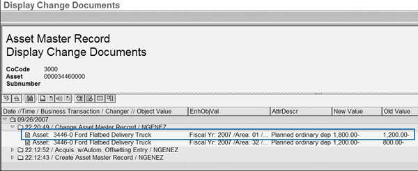 After executing the program in update mode, you can see that the system adjusted the asset’s values. You can confirm this by using the Asset Explorer or a depreciation report, or on an individual basis by viewing the change documents for the asset. Use transaction AS02, enter the asset number, and then access the menu path Environment > Change Documents > On Asset.