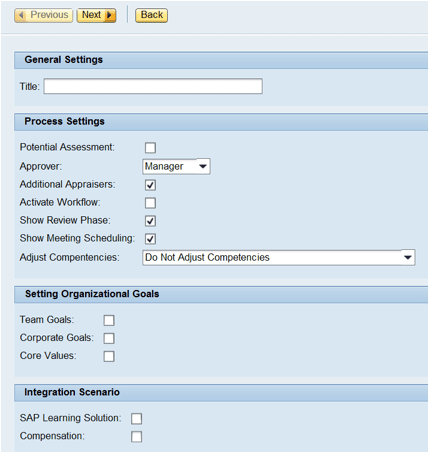 Follow IMG path Personnel Management > Personnel Development > Objective Setting and Appraisals > Define Tabs and Process Configuration for Template. PMP offers you a predefined template where you can also select the optional integrations (integrations to SAP Learning Solution [LSO] and Enterprise Compensation Management [ECM]) to identify the goals (corporate goals, core values, team goals) that will be cascaded, as well as make the required process settings (Figure 2). When you select these options, the integrations are automatically enabled when the template is created.