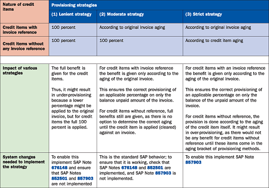 The SAP system makes the transfer postings in transaction F103 for a customer only when the net balance is positive after considering the credit items such as payments or credit notes. However, a standard SAP system provides various options to calculate the percentage for provision for these credit items in transaction F104. Generally, the moderate strategy explained in Table 1 is suitable for most of the organizations. However, some organizations may prefer other strategies.