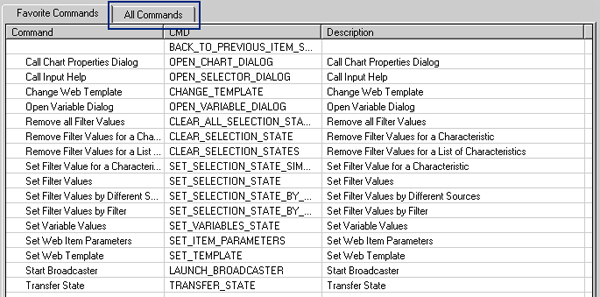 To find the standard script commands, follow Web AD menu path Navigation ? Script Item ? Web Item Parameter ? Edit Script ? Create from Wizard ? All Commands. Open Web AD and drag and drop the script item from the Miscellaneous group. Click the Script button to open the Edit Script window. Then click the Create with Wizard button to open the pre-delivered scripts (Figure 1). Click the All Commands tab to view the script command groups, and then expand them to see the related commands for each group (Figure 2).