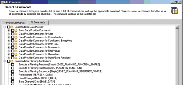 Web Application Designer 7.0 comes with standard script commands that can perform a variety of tasks such as open variable dialogue, clear selection state, and set template properties. The commands are broadly classified into four groups: data provider, planning applications, Web items, and Web templates. These groups help you locate the appropriate commands for your task.