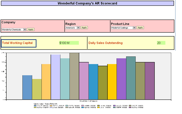 Figure 4 shows the accounts receivable dashboard for the Wonderful Company. When the user double-clicks Total Working Capital, the dashboard resets the variable selections and loads the rolling 12-month graph for this KPI (Figure 5).