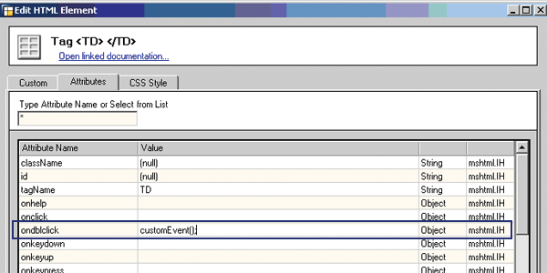 For this example, we want to add an event that occurs when a user double-clicks Total Working Capital. In Web AD, right-click Total Working Capital and follow menu path Table ? Edit ? Edit Cell. The Edit Cell dialog screen appears as shown in Figure 6. In the Attributes tab, define the attribute ondblclick as customEvent(). Then click Apply and OK.