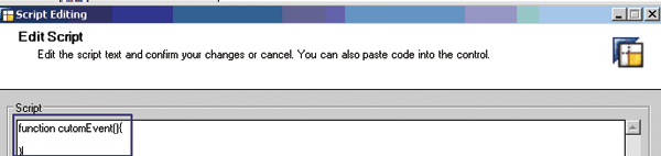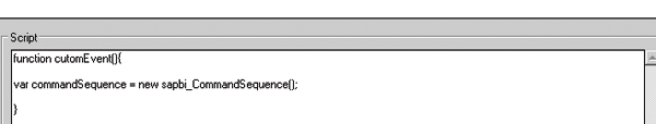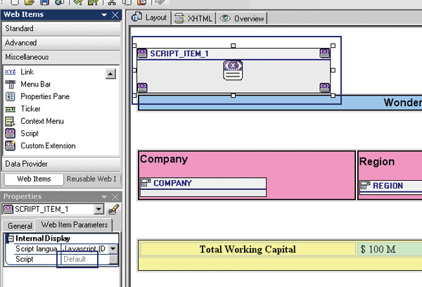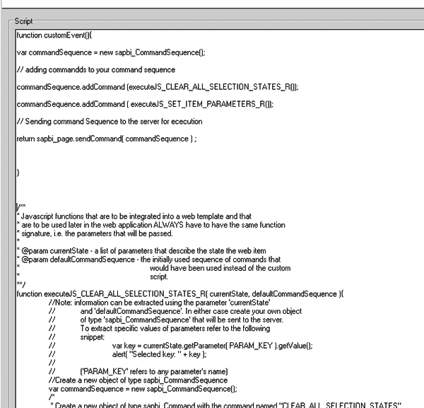 Next, drag and drop the script item from the left side of the page into the template on the right side of the page as shown in Figure 7. Click the Default button in the Web Item Parameters tab in the bottom-left corner of the page. This calls the Script Editing dialog window. Define the custom event by entering the code shown in Figure 8.