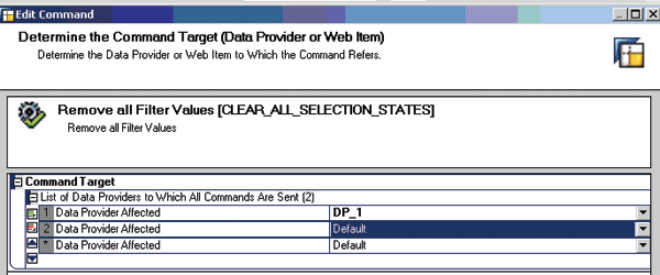 Then enter the required parameters for the selected commands. In our example, the Remove all Filter Values command requires the list of the data providers from which to remove the filter values. For this command, enter the data providers shown in Figure 10. Click OK to view the generated code in the script editor (Figure 11). Figure 12 shows the parameters for the Change Web Template script command and Figure 13 shows the generated code.