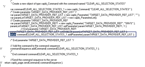 Use the commandSequence.addCommand method to add the exported commands. Then send the cumulated commands to the server by using the return sapbi_page.sendCommand (commandSequence) method. Figure 15 shows what the final code should look like. Now whenever a user double-clicks Total Working Capital in Figure 4, the system executes the custom script commands and shows the company view by default.
