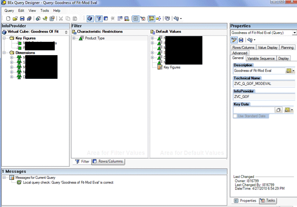 Create a BEx query using BEx Query Designer (Figure 7). This query should contain all the fields from your InfoProvider that you want to display in your Xcelsius dashboard.