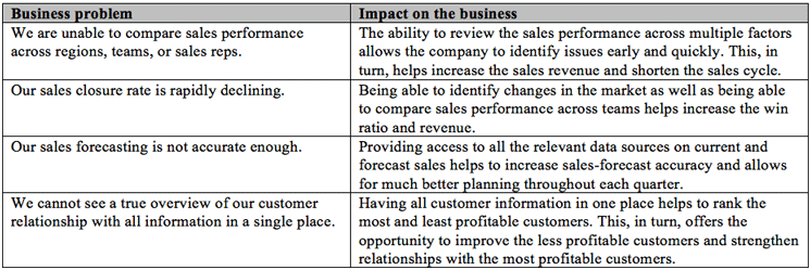 You should meticulously document the gathered information so that you now have two sets of information as part of the process. The first asset is the overview that you created in step 1, where you documented the business problems and the impact to your business. An example of this kind of information-gathering is shown in Table 2.