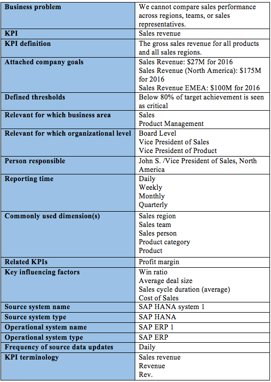You notice that, at this stage, I do not advocate defining the key performance indicators (KPIs) that you are going to use for your dashboard. This comes later in step 2. You are also not yet defining the dashboard layout and navigation steps (those come later as part of step 3).