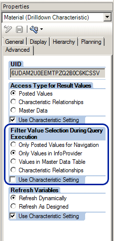 When you refresh the LOV in SAP BusinessObjects, the system retrieves SAP NetWeaver BW values from master data tables or InfoProviders, depending on the setting in the BEx Query Designer. By selecting the Only Values in the InfoProvider option in the Filter Value Selection During Query Execution section of the characteristic properties, you increase the performance of prompt screens (Figure 4).