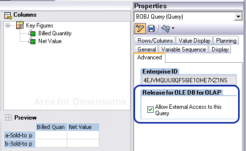 External systems cannot use SAP NetWeaver BW queries unless you allow them access. To allow external access to a query, select the Allow External Access to this Query check box from the Advanced tab of the Properties area of the query as shown in Figure 5.