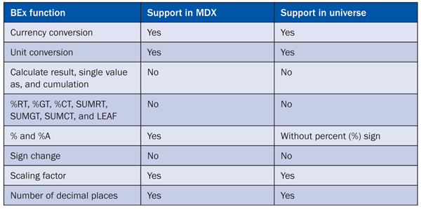 Although BEx queries are better data sources for SAP BusinessObjects than InfoProviders, they also have some restrictions. Table 1 lists some common functions and whether or not SAP BusinessObjects supports them. In Table 1, Support in MDX means that the correct value and formatting for the query is passed via MDX statements to SAP BusinessObjects. Subsequently, Support in universe means that when a dataset is passed to SAP BusinessObjects, the SAP BusinessObjects universe supports the values. As a general rule, MDX supports calculations carried out before aggregation, but calculations carried out after aggregation are not supported.