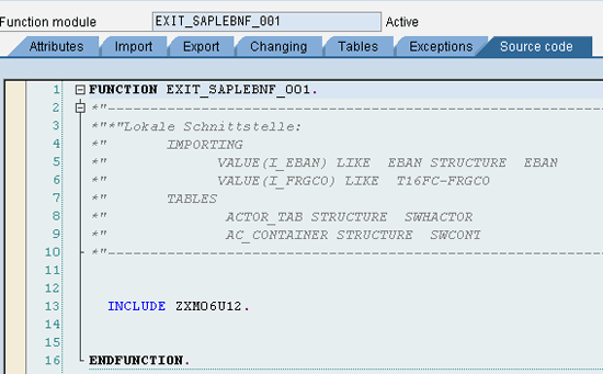 After you double-click the include name INCLUDE ZXM06U12, you receive a warning message. After you press Enter, the system creates the include. Write your code to determine the approving agent of the purchase requisition (Figure 11).