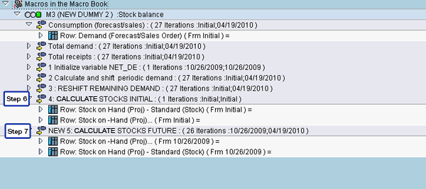 Note how the subrows under CALCULATE STOCKS INITIAL and CALCULATE STOCKS FUTURE determine the stock on hand projection calculations for initial and future periods so that SNP heuristics can read this demand and create the related planned receipts in the future.