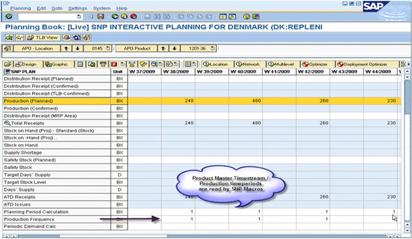 The SNP planning book and macros have been configured so that the system considers the production planning frequency (Figure 8). As shown earlier, the product master has the time stream saved in its master data fields. The macro’s logic arranges the demand so that SNP heuristics looks at the total demand and total receipts together with the production frequency active periods, and then SNP heuristics creates the production planning proposals to match the production frequency.