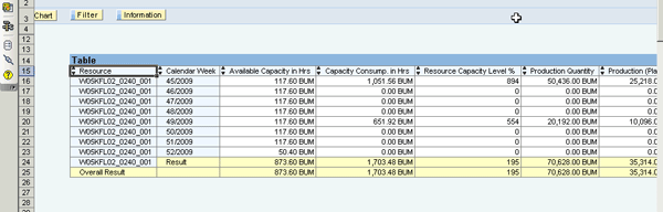 After the client completed the SNP planning run, I developed an SAP NetWeaver BW query planning results analysis by using the remote cube on the SNP planning area. Based on this query, users can conduct both macro- and micro-level planning run analyses. Figure 17 offers a sample view of this metrics-based analysis. It gives the available capacity and capacity consumption on each resource so that users have a clear understanding of how much production quantity has been planned and where the resources have been overloaded or underloaded. Users then can make any necessary adjustments.