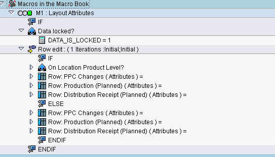 Macro 1, shown in Figure 9, locks the planned key figures at an aggregated level and leaves them open for input only at the Product/Location level. In this first macro, all the related key figures — including PPC Changes, Production (Planned), and Distribution Receipt (Planned) — are locked when they are not at the Product/Location detailed level. They are open for editing only when they are at Product/Location level. By using these key figures, the later macros formulate the logic for the planned receipts time buckets creation.