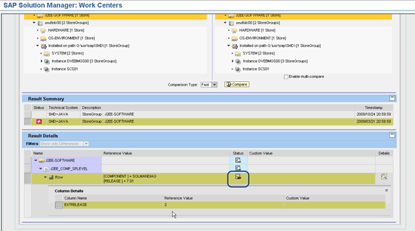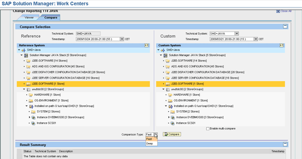 In the Compare Selection area at the top of the comparison tool, select the technical systems or time stamps you want to compare. You can set a system or time stamp as a reference in the left panel, and another system or time stamp as a custom selection in the right panel. After you select the systems for comparison, you can restrict the comparison to a particular store group (as opposed to the entire system). Under the left and right panels, there is a Comparison Type drop-down menu in which you can choose a Fast compare or a Deep compare. The fast compare only displays changes between store groups and skips any identical elements. The deep compare compares all entities, even if they are identical. Select the type of comparison and click the Compare button. The comparison run is triggered and the results are displayed in the Results Summary section at the bottom of the screen (Figure 11). To see the details, select the comparison system on the second line of the Results Summary. The Result Details section is then displayed.