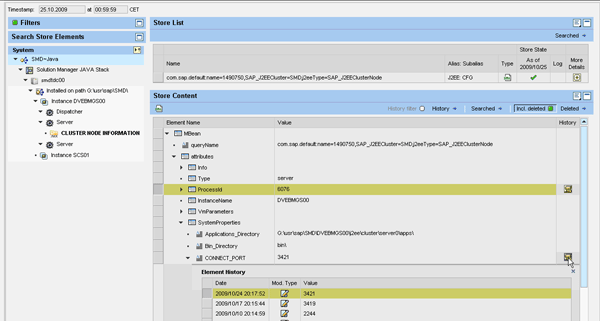 Click the tab for the instance with the most changes (SMD – Solution Manager JAVA Stack in this example). As you can see in Figure 4, changes are displayed in various change groups. The change groups for this particular Java stack are Dispatcher Configuration, Server Configuration, Node Type Independent Configuration, and Software Maintenance. Figure 4 shows that there were 36 technical configuration changes to the server node on the 24.10.2009.