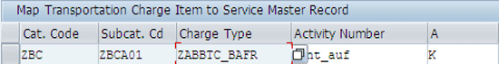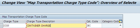 The subcategory code is the linkage between charge types and the category codes you defined above. ZBCA01, shown in Figure 12, is the prefix I am using for the subcategory codes. The difference between a category code and a charge type is that a charge type is the condition type based on which the charges are calculated, while a category code is the reference group within which all charge types are compiled together. All rates and values are maintained under a charge type only.