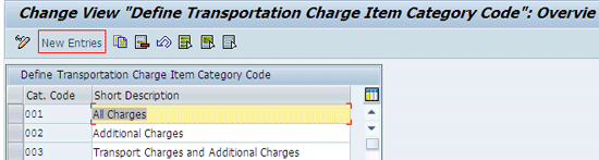 You align the SAP TM organizational units with SAP ECC (i.e., you assign the purchasing business areas from SAP TM to the organizational units in purchasing in the SAP ECC system). Follow menu path SPRO > Integration with other SAP components > Transportation Management > Invoice Integration > Invoicing > Definition for transportation charge elements > Define category codes. Click the New Entries button and enter the category codes and description (Figure 15).