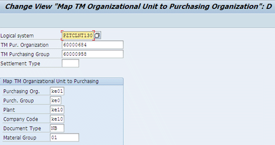 Then follow menu path SPRO > Integration with other SAP components > Transportation Management > Invoice Integration > Invoicing > Mapping of organizational units > Assign organizational units for Purchasing. Enter the values for the Logical system, TM Pur. (purchasing) Organization, and TM Purchasing Group. Then enter the values for the SAP ECC Purchasing Org. (organization), Purch. Group, Plant, Company Code, Document Type, and Material Group (Figure 16).