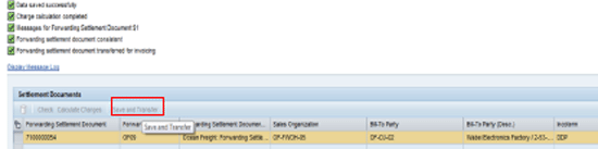 You can have separate TCCSs for each stage in the forwarding order. Based on the services provided by the carrier or vendor the charges are determined in the freight order. Then as a follow-up action from the freight order you create a freight settlement document. This freight settlement document is the draft invoice in SAP TM. In the freight settlement document you click the Save and Transfer button (Figure 4). The service is then called in SAP PI, which actually creates the service PO and the service entry sheet in SAP ECC.