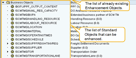 However, in my example of an enhancement in the structure, you start the BOBF Enhancement Workbench using transaction code /BOBF/CUST_UI, as shown in Figure 5. It shows the list of enhancement objects that already exist as well as the standard objects that you can enhance. The top text bubble indicates the description of various business objects and the second one indicates the name of the technical object for which the description has been provided by the first arrow.