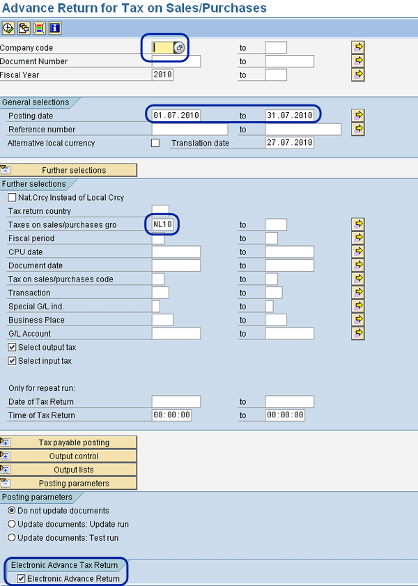 When you have finalized all the settings, you can prepare the VAT declaration. The declaration process starts with the standard VAT report RFUMSV00 (or transaction S_ALR_87012357). You can start this transaction by following the user menu path Accounting > Financial Accounting > General Ledger > Reporting > Tax Reports > General > Advance return for Tax on Sales/purchase. Figure 10 shows the selection screen of this report. You must enter either the company code or the tax group in the Taxes on sales/purchase gro field. In this case, it is the tax group NL10.