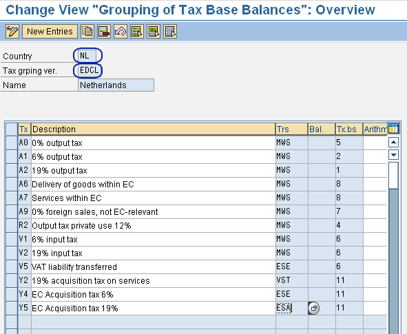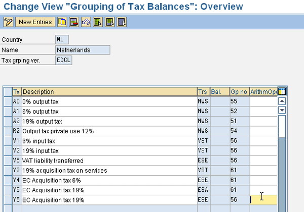 Figure 4 shows an example of the settings for the Netherlands. The columns have the same meaning as for the tax base amounts. In the example, you can see that it is possible to have the same VAT code reported in two places. In this case, the VAT code Y5 is reported in groups 61 and 56. Prior to electronic tax declaration, only Belgian and German tax authorities defined group numbers for their reporting. Companies had to report, on paper, that the amount in group 61 equals xxx, the amount in group 56 equals yyy, and so on. For electronic tax declaration, SAP has adapted this way of working for other countries as well.
