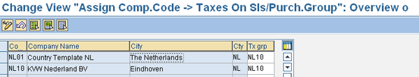 This setting goes together with the previous setting. Use transaction OBCF or follow IMG menu path Financial Accounting (New) > General Ledger Accounting (New) > Periodic Processing > Report > Sales/Purchases Tax Returns > Assign Company Codes to Tax on Sales/Purchases Groups. When you start this transaction, you’ll see all existing entries. You only need to enter the appropriate tax group for the company code. In this example, I entered NL10 for company codes NL01 and NL10, where company codes NL01 and NL10 have been assigned to tax group NL10 (Figure 6).