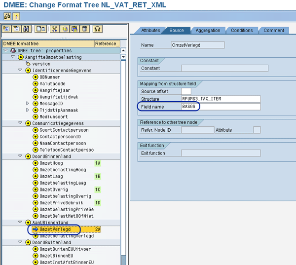 Figure 8 shows part of the Dutch XML file format (unfortunately all the text is in Dutch). The figure shows the details for the line called OmzetVerlegd. On the right side of the screen, you can see that field BAS06 from the structure RFUMS3_TAX_ITEM is the source of OmzetVerlegd. This is related to settings made for the base value in Figure 3. VAT codes V1, V2, and V5 are allocated to group 6, which is the same 6 that is in BAS06.