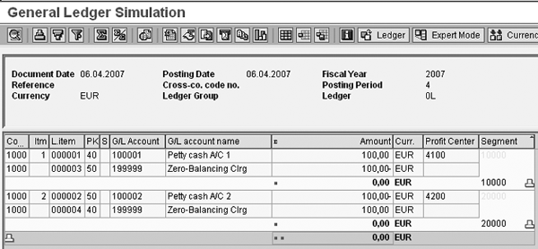In Table 5, the document is zero-balanced for the segment, but not for the partner segment. To demonstrate the function of document splitting, I use transaction FB50 to post the similar transaction (Figure 4). The financial document has three line items: account 100001 for 100.00, 100002 for -60.00, and 100003 for -40.00. These items have profit centers 4100, 4200, and 4300, respectively. As you can see in Table 3, the system assigns these profit centers to segments 10000, 20000, and 30000, respectively.