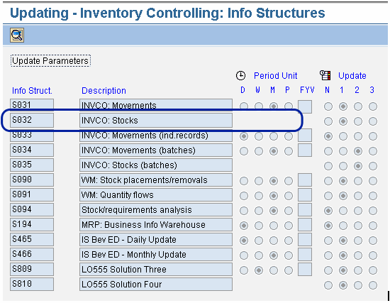 Information structure S033 is one of the information structures available in the inventory controlling component of LIS. Information structure S031 is updated with all key figures pertaining to material movements as it relates to valuated stocks and vendor consignment stock. The standard period for the updating of this information structure is a month; however, you can define your own period. The information structure is updated with the current valuated and vendor consignment stocks when a goods movement occurs. Also, the information structure is updated with the stock values when a goods movement and invoice verification or revaluation occurs. The period is not applicable to this information structure as shown in Figure 10.