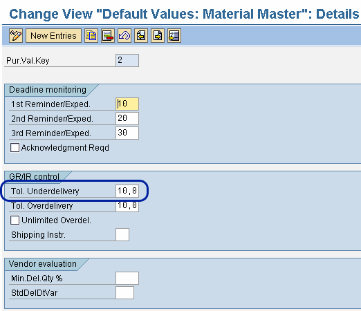 Alternatively, the delivery completed indicator is activated if the underdelivery tolerance in the purchasing tab of the material master data is set so low that underdelivery tolerance is not reached even in the event of underdelivery. Although the system treats underdelivery as a partial delivery, a warning message is generated if the entries are checked before posting the goods receipt. The system allows you to define a percentage value for underdelivery tolerance. If the total of previously delivered and currently entered quantity is under the defined tolerance, the system creates a warning message during a check. Otherwise, if the total is within under-delivery tolerance, no message is issued. It is also possible for you to define a default value for underdelivery tolerance for materials via purchase value keys in customizing for MM. Follow menu path SAP Customizing Implementation Guide > Materials Management >Purchasing >Material Master > Define Purchasing Value Keys (Figure 4).
