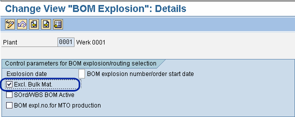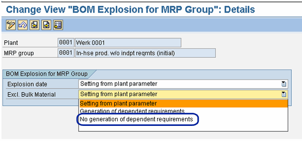 You can set the bulk material setting for plants via transaction OPPQ and for the MRP group via transaction OPPR. To ensure that no requirements are generated for bulk materials, set the Excl. bulk material indicator for the BOM explosion (Figure 8). The value should be maintained in the MRP group placing a check in the box next to Excl. Bulk Mat (Figures 8 and 9).