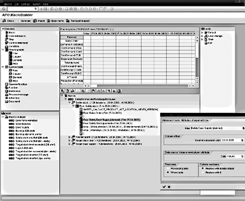 3. Adapt the safety stock macro. Follow the menu path Supply Network Planning >Environment> Current Settings>Macro Builder. Choose your planning book, Data View 1, and click on Edit. Move the SafetyStck/reorderPoint/ targetStckLevel macro to the work area. Change the fifth line of this macro (which is an operator/function step) from the existing value ) ; 0 to the new value ) ; (Figure 4). Make sure to leave a space between the close-bracket and semicolon characters.